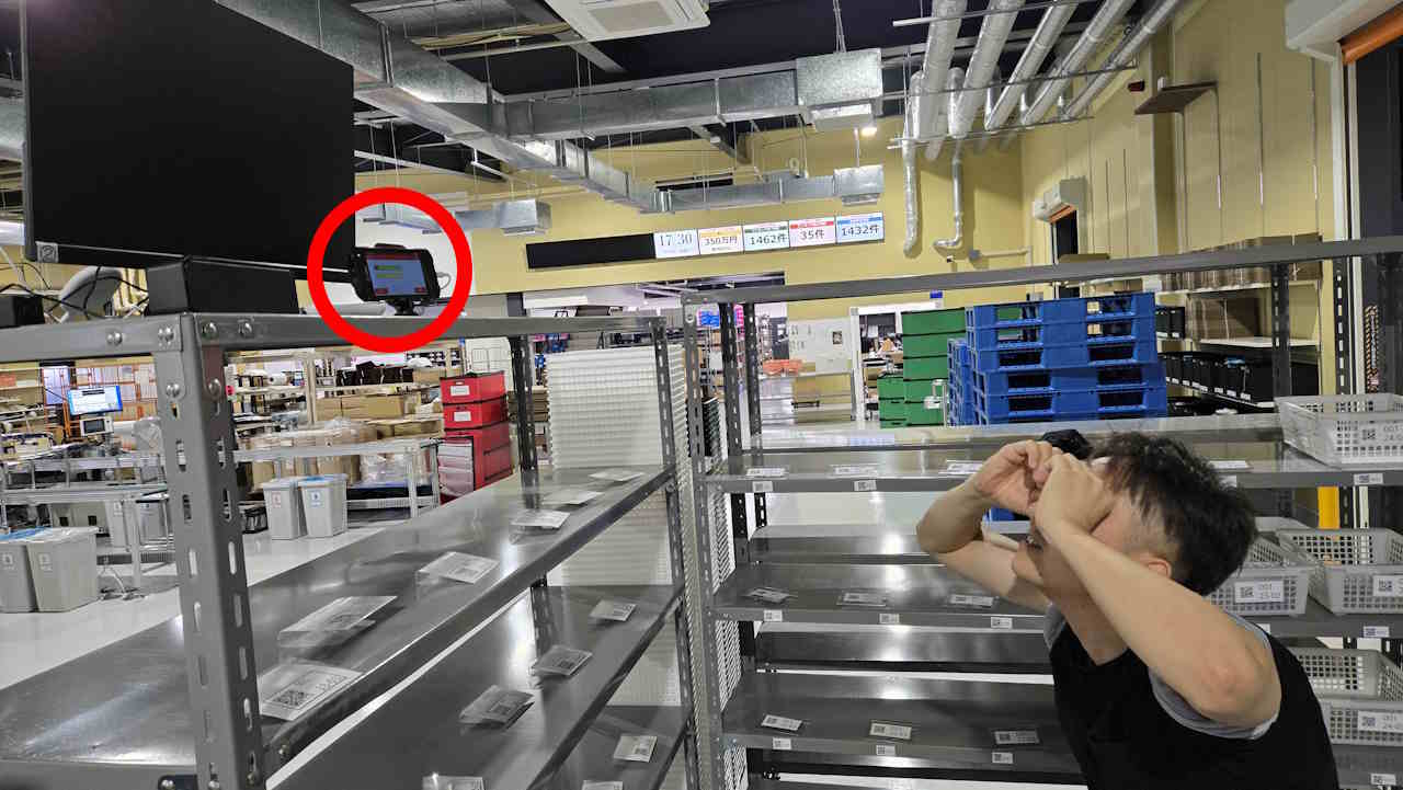 仕分けシステムなので集めてきた商品を、ご注文ごとに仕分けます。商品を手で持って移動することになります。スマホを手に持ってるので商品持てないじゃん?となるかもしれませんが、リングスキャナーは指にはめるので商品をつかんで動かすことはできます。
