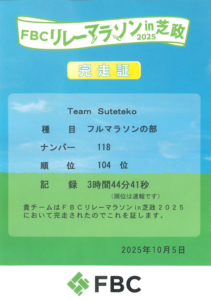 今年も FBCリレーマラソン in 芝政 2025 ~フルマラソンの部~ に参加しました!