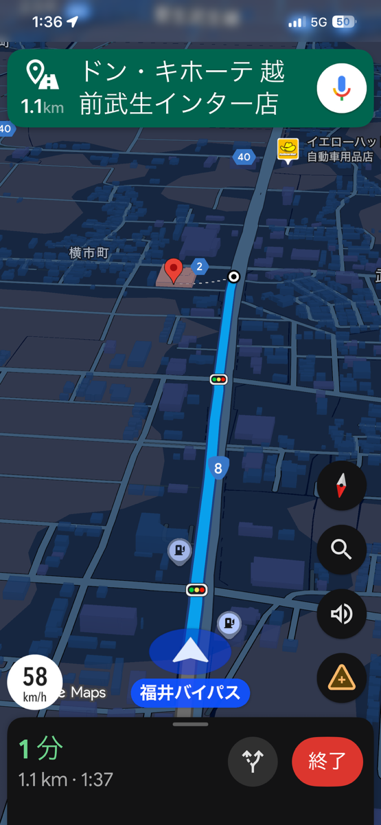 自宅のあわら市から福井市のドンキホーテ大和田店まで、深夜だと20分くらいか。いける。