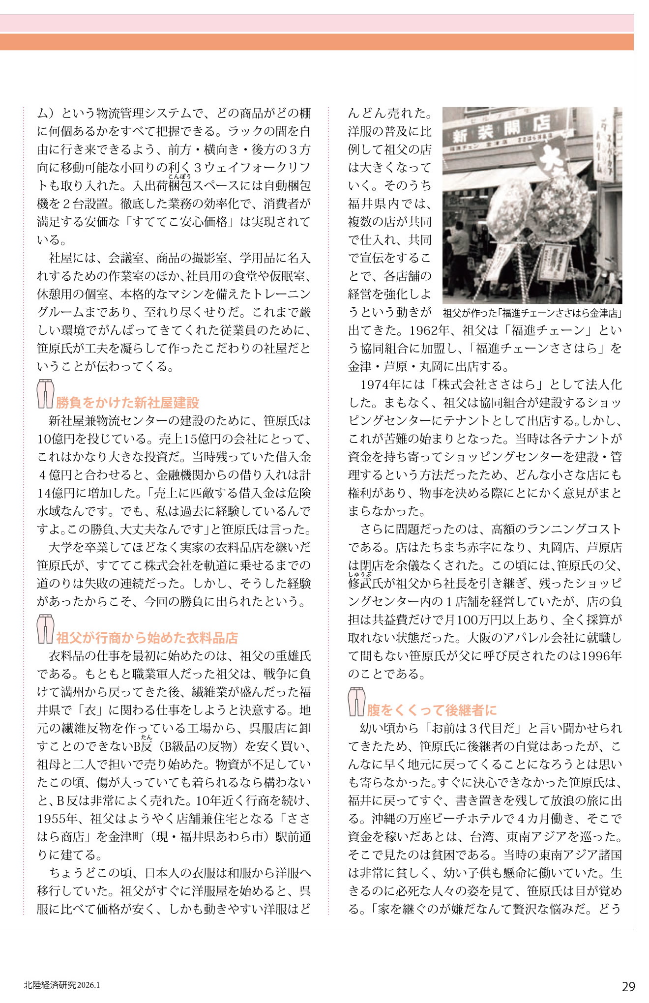 洋服の普及に比例して祖父の店は大きくなっていく。そのうち福井県内では、複数の店が共同で仕入れ、共同で宣伝をすることで、各店舗の経営を強化しようという動きが出てきた。1962年、祖父は「福進チェーン」という協同組合に加盟し、「福進チェーンささはら」を金津・芦原・丸岡に出店する。