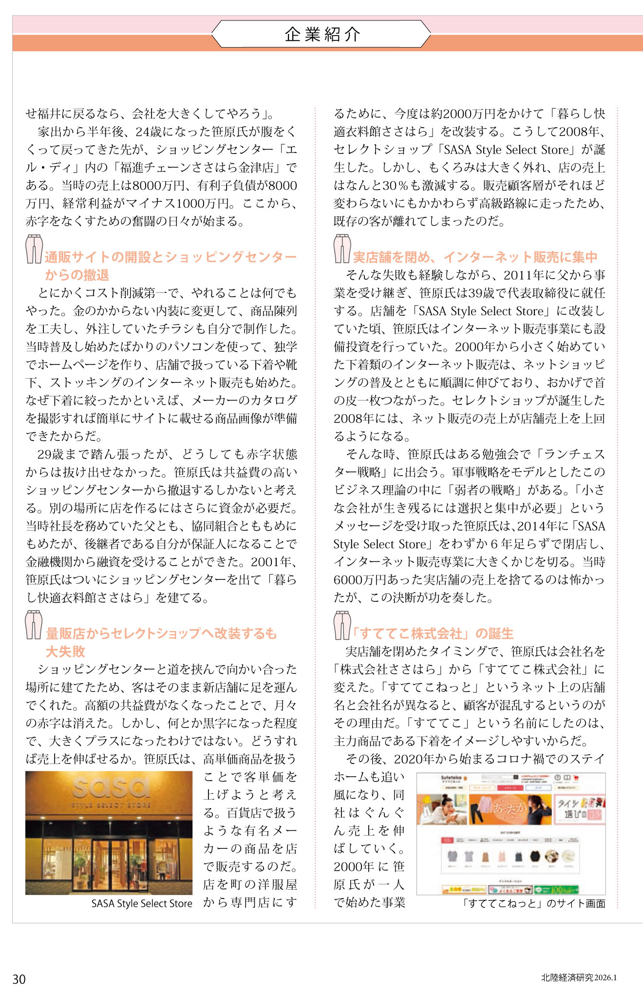すててこ株式会社は、下着や靴下、ストッキングなどのインナーを中心にインターネット販売を行う、福井県あわら市の企業。徹底した業務効率化で安価な販売価格を実現し、ここ数年、右肩上がりに業績を伸ばしている。2019年に経済産業省「はばたく中小企業・小規模事業者300社」に選出され、楽天市場やYahoo!ショッピングで何度も受賞を果たした。2024年度には売上15億円を突破し、2025年2月には、敷地面積17800㎡の新社屋兼物流センターが完成している。まさに順風満帆に見える同社だが、過去には数々の失敗の経験があるという。今回、新社屋を見学させてもらいながら、代表取締役社長の笹原博之氏に詳しく話を伺った。